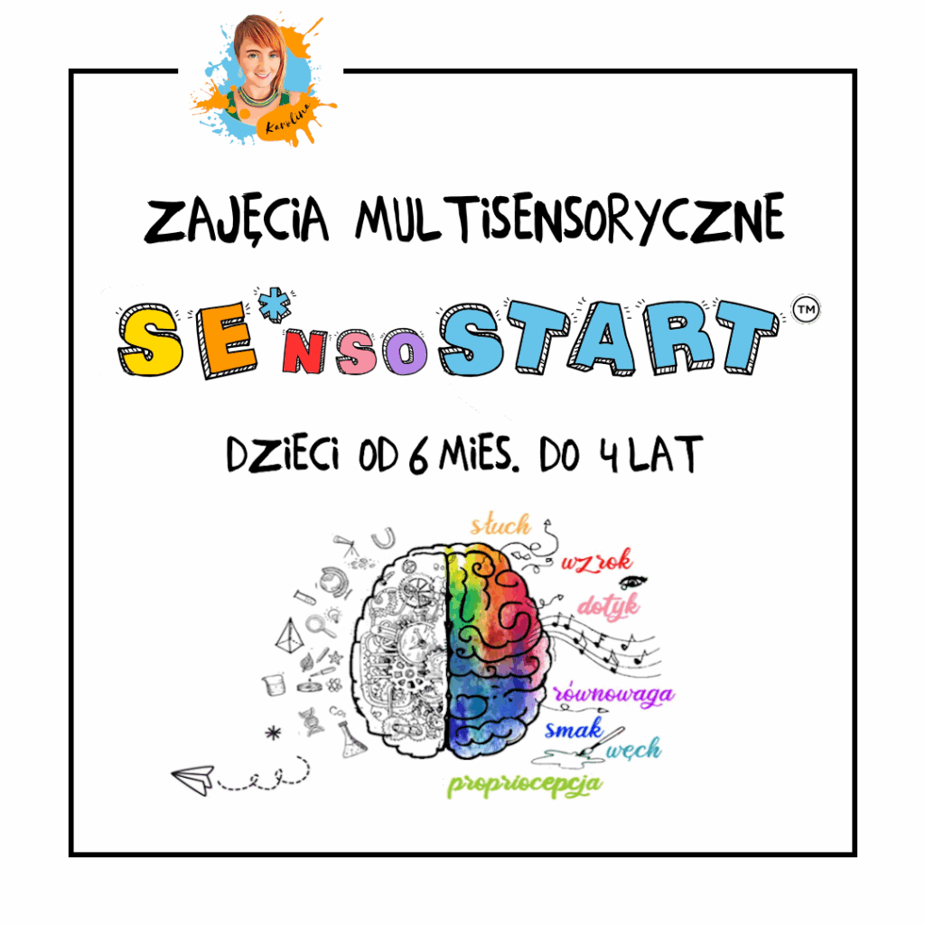 SE*nsoSTART ™ to zajęcia multisensoryczne dla dzieci już od 6 miesiąca życia (po rozszerzeniu diety) podczas których będziemy stymulować wszystkie 8 zmysłów – wzrok, słuch, węch, dotyk, smak, propriocepcję, równowagę oraz interocepcję. Zajęcia przebiegają wg stałego planu – masażyk, zajęcia rozwojowe „suche”, zajęcia rozwojowe „brudne” – za każdym razem wg innego scenariusza. Proponowane aktywności są modyfikowane do możliwości i potrzeb danej grupy, jest także czas na zabawę własną. Rodzice dostają również informację jak bawić się ze swoim dzieckiem w domu, by wspierać jego prawidłowy rozwój.